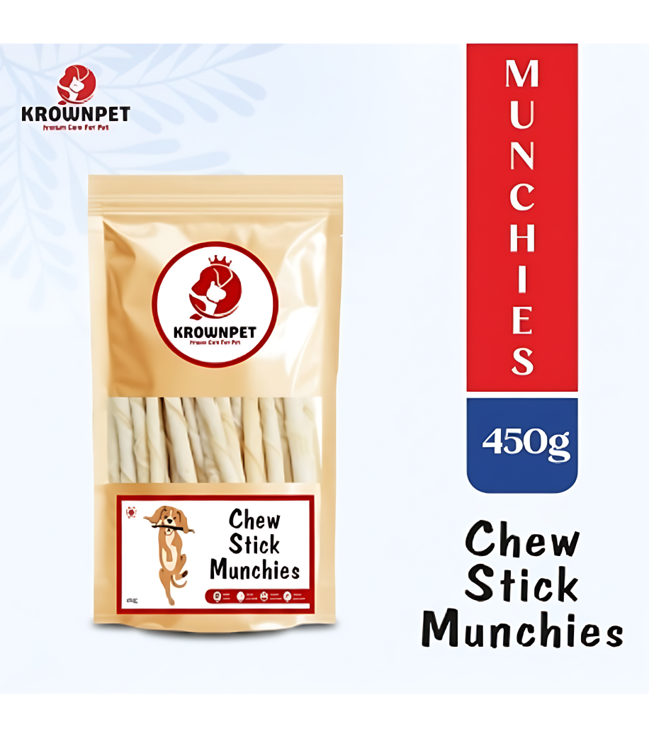 KROWN PET™ Chew Stick Munchies are protein-rich, natural dog treats designed to satisfy your pet’s natural urge to chew while supporting overall health. Made from top-quality animal hide, these munchies help keep dogs engaged, active, and happy.