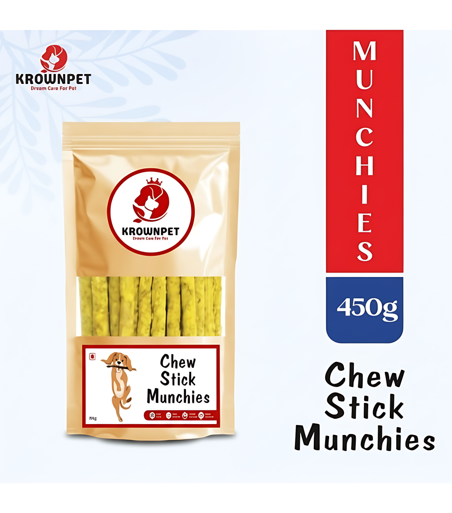 KROWN PET™ Chew Stick Munchies are specially crafted protein-rich dog treats made from top-quality animal hide. These chew sticks help satisfy your dog’s natural chewing instinct while supporting oral hygiene, jaw strength, and overall health.